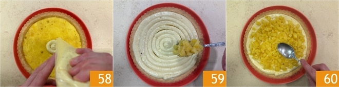 Distribuye la crema pastelera restante 58, luego añade los cubitos de piña caramelizada 59 y nivela todo con el dorso de una cuchara 60.