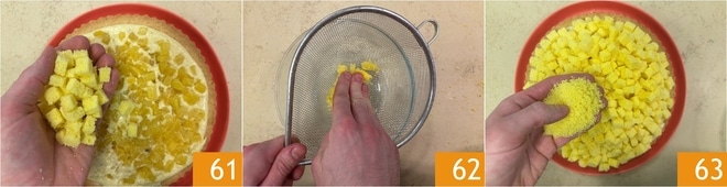 Espolvorea la superficie con los cubitos de bizcocho 61. Desmenuza los cubitos restantes pasándolos por un colador 62 y distribuye las migas obtenidas sobre la tarta 63.
