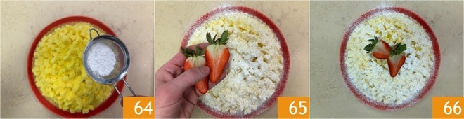 Completa con azúcar glasé 64 y una fresa fresca cortada a la mitad 65. Deja reposar en el frigorífico por al menos 2 horas antes de servir tu tarta mimosa 66!