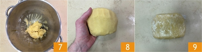 Debes obtener una masa compacta y uniforme 7. Forma una bola 8, envuélvela en film transparente 9 y deja reposar en el frigorífico por al menos 3 horas.