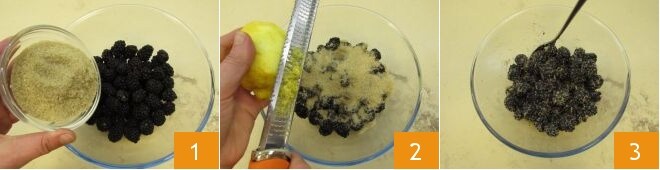 Para preparar la tarta de moras, comienza colocando las moras en un bol, añade el azúcar moreno 1 y la ralladura de medio limón 2. Mezcla con una cuchara 3, cubre con film transparente y deja macerar las moras a temperatura ambiente durante al menos 4 horas (o toda la noche si prefieres).