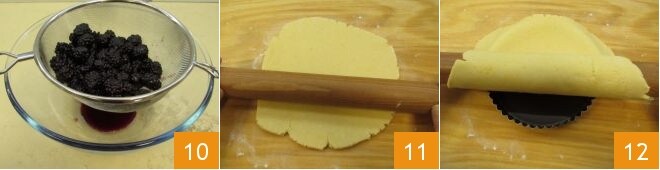 Después de las horas de maceración de las moras, escúrrelas en un colador recogiendo el líquido en el bol 10. Recupera la masa quebrada y retira 2/3 de ella, el resto colócalo en el frigorífico siempre envuelto en film transparente. Espolvorea la superficie de trabajo con muy poca harina y extiende la masa con el rodillo en un disco de aproximadamente medio centímetro de grosor. Luego, enrolla la masa sobre el rodillo y desenrolla sobre un molde perforado de 18 cm con bordes ondulados 12 (puedes usar un molde de tarta normal, no será necesario engrasarlo).