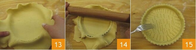 Presiona suavemente el fondo y el borde de la masa en el molde 13, recorta el exceso de masa pasando el rodillo por el borde del molde 14. Pincha el fondo de la tarta con los dientes de un tenedor 15.