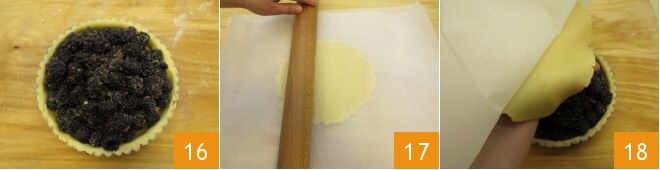 Rellena la tarta con las moras que has escurrido 16, distribuyéndolas de manera uniforme. Ahora toma la masa quebrada restante y extiéndela entre dos hojas de papel de horno 17, luego elimina una de las hojas y utiliza la otra para transferir la masa sobre el relleno 18 de manera que lo cubra completamente.