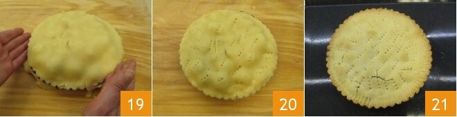 Presiona bien los bordes eliminando el exceso de masa 19. Con los dientes del tenedor, pincha la superficie 20. Hornea la tarta en el horno precalentado a 175° durante 35 minutos, en la bandeja más baja del horno. Después de este tiempo, coloca la tarta en la bandeja central y continúa la cocción durante otros 5 minutos para que se dore ligeramente en la superficie. Una vez cocido, deja enfriar completamente la tarta antes de servirla 21.