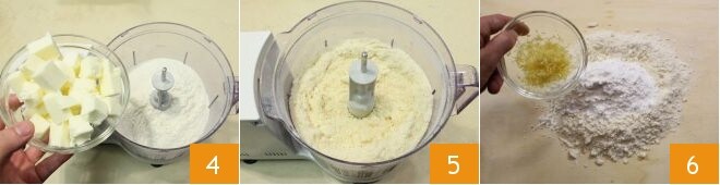 Ahora prepárate para la masa quebrada: en un procesador de alimentos, coloca la harina tamizada, una pizca de sal y la mantequilla fría en trozos 4, luego enciende brevemente las cuchillas para obtener una mezcla arenosa 5. Vierte la mezcla arenosa sobre una superficie de trabajo (o en un bol) y añade el azúcar glas tamizado y la ralladura de medio limón 6
