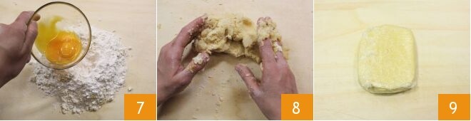 Crea el clásico volcán con un hueco en el centro para colocar las dos yemas 7. Luego, empieza a mezclar todo primero con un tenedor, y cuando los huevos hayan absorbido el polvo, continúa a mano 8. Amasa brevemente, solo el tiempo necesario para compactar la masa, para que la masa quebrada no se caliente demasiado con el calor de las manos y se mantenga quebradiza. Forma un bloque, aplánalo y envuélvelo en film transparente 9, luego colócalo en el frigorífico para que se endurezca durante al menos 30 minutos.