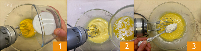 Para preparar la tarta de Nutella y mascarpone, primero derrite la mantequilla en un cazo y déjala enfriar. Mientras tanto, bate los huevos junto con el azúcar con las varillas eléctricas 1. Después de unos 10 minutos, la mezcla estará esponjosa, entonces vierte la mantequilla derretida y enfriada en un hilo 2. Finalmente, añade los ingredientes secos tamizados previamente, manteniendo siempre las varillas en funcionamiento: comienza con la harina, una cucharada a la vez 3.
