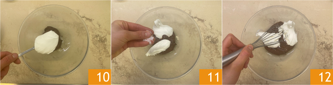 Mientras tanto, prepara la crema para el relleno: en un bol, mezcla la Nutella y el mascarpone 10, luego añade una pizca de sal 11 y bate con la varilla para integrar bien la mezcla 12. Transfiere la crema obtenida a una manga pastelera con boquilla lisa de gota.