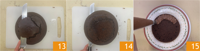 Una vez enfriada, corta la parte superior de la tarta para nivelar la superficie 13 y divídela por la mitad en sentido horizontal 14. Rellena la primera capa con la crema 15.