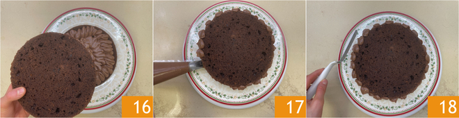 Cubre con la segunda capa 16, luego exprime un poco de crema en los bordes 17 y nivela con la espátula para distribuirla de manera uniforme 18.