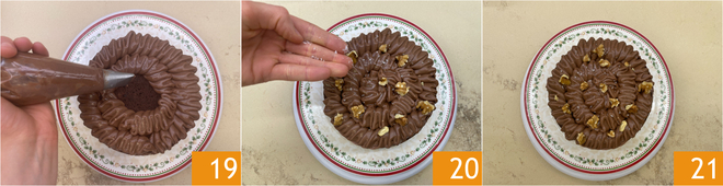 Con la crema restante, decora la superficie creando pequeñas olas con movimientos de arriba hacia abajo 19. Por último, adorna con nueces y sal de Maldon 20. ¡Tu tarta de Nutella y mascarpone está lista para disfrutar 21!