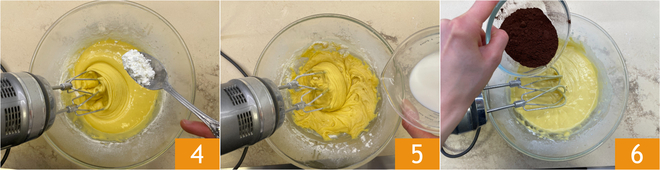 Añade de la misma forma también la maicena 5. Después de haber incorporado los ingredientes secos, diluye con la leche 5 y finalmente añade el cacao 6.