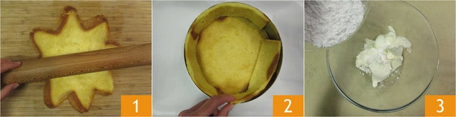 Para preparar la tarta de pandoro y Nutella®, con un rodillo extiende las rebanadas de pandoro a aproximadamente ½ cm 1. Recorta una con un aro de 18 cm, coloca el mismo aro sobre una bandeja sobre la que habrás colocado papel de horno. Coloca dentro la rebanada recortada que servirá de base. Corta la otra rebanada extendida de pandoro en tiras de 5 cm de grosor, elimina los extremos irregulares para igualarlas y cubre con ellas el borde del aro 2. Para rellenar: remoja la gelatina en agua fría durante al menos 10 minutos. En un bol, vierte el mascarpone y el azúcar glas 3.