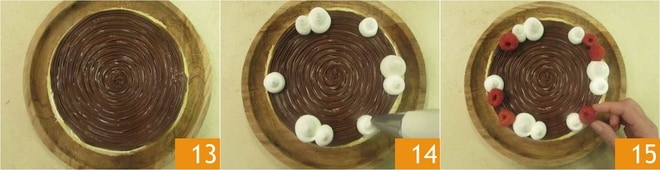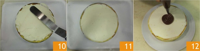 y nivela la superficie con una espátula 10. Transfiere la tarta al frigorífico durante al menos 2 horas. Una vez solidificada 11, comienza a decorar con Nutella® insertada en una manga pastelera con boquilla estriada: deberás obtener una espiral para cubrir toda la superficie, puedes comenzar desde el centro y hacer círculos concéntricos 12.