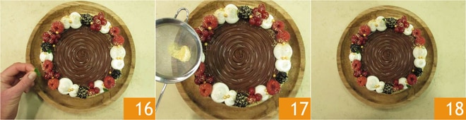 moras y grosellas, termina con hojitas de mirto 16. Puedes enriquecer con granillo de pistachos, algunos adornos de azúcar dorado y un toque mágico: polvo de oro 17. ¡Tu tarta de pandoro y Nutella® está lista para ser disfrutada!