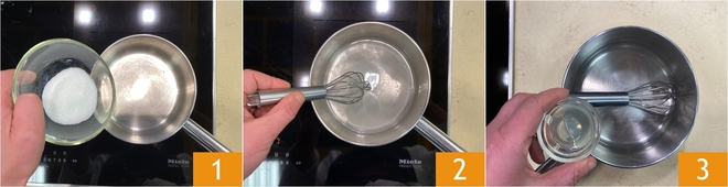 Para preparar la tarta de panettone, comienza por el almíbar: en un cazo vierte el agua y el azúcar 1. Enciende el fuego y lleva a ebullición mezclando 2, el azúcar debe disolverse completamente. Deja enfriar y añade el licor 3. Mezcla y deja a un lado.