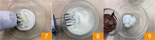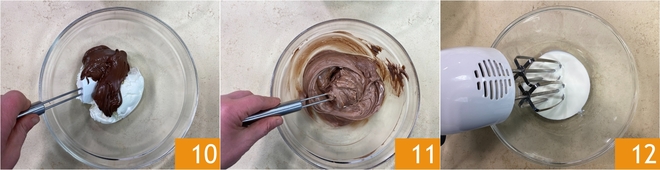 Monta con las varillas eléctricas 7 hasta obtener una crema lisa y espumosa 8. Dedícate ahora a la segunda crema: en un bol mezcla el mascarpone y la crema de avellanas 9.