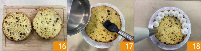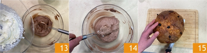 Incorpora la nata montada a la crema 13 mezclando delicadamente de abajo hacia arriba hasta obtener una crema homogénea 14. Transfiere las cremas en 2 mangas pasteleras con boquilla lisa de 12-14 mm. Estás listo para montar el dulce: toma el panettone y, comenzando desde la base, corta 2 rebanadas de 3-4 cm de grosor 15.