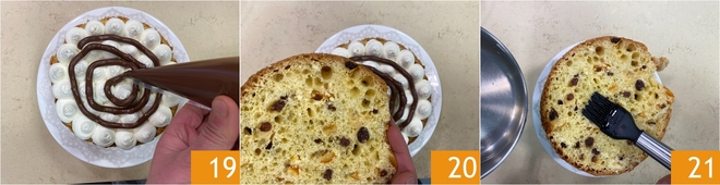 Añade encima una espiral de crema de avellanas, ayudándote con otra manga pastelera sin boquilla 19, luego cubre con el segundo disco de panettone. Empapa también este con un poco de almíbar 21.