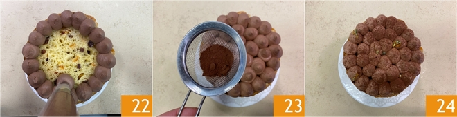 Decora la tarta con los copos de crema de mascarpone y avellanas 22, luego espolvorea con cacao amargo 23 y adorna con trocitos de hoja de oro 24. Deja reposar tu tarta de panettone en el refrigerador por un par de horas antes de servirla!