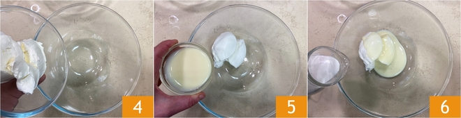 Pasa a la crema de mascarpone: vierte en un bol grande el mascarpone 4, la leche condensada 5 y la nata fresca 6.