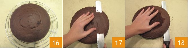 y déjala enfriar completamente sobre una rejilla 16. Cuando esté completamente fría, con un cuchillo largo de hoja dentada corta la cúpula superior de la tarta para igualar su superficie 17. En este punto, tendrás que obtener 3 discos de igual grosor: corta la tarta siempre con un cuchillo largo dentado de manera horizontal 18