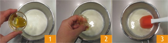 Para realizar la tarta de pistacho con namelaka de yogur, comienza con la preparación de la namelaka: primero pon la gelatina en remojo en agua fría y funde el chocolate blanco al baño maría o en el microondas. Calienta la leche y la miel en un cazo 1. Apenas llegue a ebullición, apaga el fuego, añade la gelatina escurrida 2 y mezcla para disolverla completamente 3. Reserva un momento.
