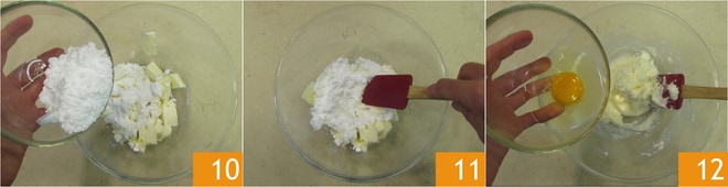 Pasa a la masa quebrada: coloca la mantequilla blanda y el azúcar glas en un bol 10 y mezcla con la espátula 11, luego añade el huevo 12 y mezcla de nuevo para que se absorba. No te preocupes si queda granuloso.