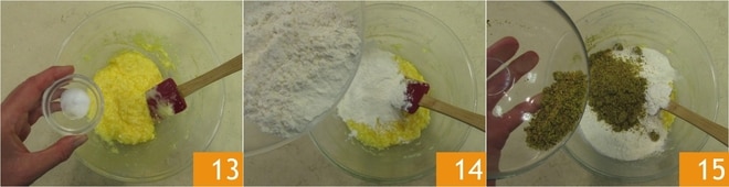 En este punto, añade la sal 13, la harina 00 14 y la harina de pistachos 15.