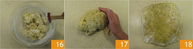 Amasa rápidamente primero en el bol 16 y luego en la superficie de trabajo 17 para obtener una consistencia compacta y homogénea, teniendo cuidado de trabajar la mezcla lo menos posible. Aplana ligeramente la masa, envuélvela en film y deja reposar en la nevera durante al menos 2 horas (mejor toda la noche) 18.