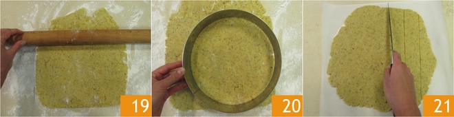 Transcurrido el tiempo de reposo, extiende la masa en la superficie ligeramente enharinada hasta un espesor de aproximadamente 3 mm 19. Corta la masa con un aro de 22 cm de diámetro y 3 cm de altura 20, luego saca del resto de la masa tiras ligeramente más anchas que la altura del aro 21.