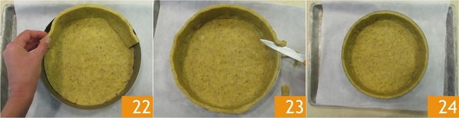 Transfiere la base junto con el aro a una bandeja forrada con papel de horno (o una alfombrilla microperforada) y pincha la base. Forra los lados con las tiras 22, luego presiona suavemente con los dedos para que se adhieran a la base. Elimina el exceso de masa con un cuchillo 23 y coloca todo en la nevera mientras continúas con la receta 24.