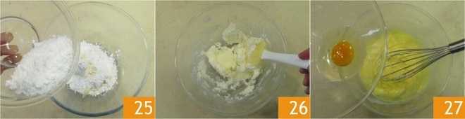 Dedícate a la crema frangipane: coloca la mantequilla blanda y el azúcar glas en un bol 25 y mezcla con una espátula 26, luego añade un huevo a la vez, mezclando con un batidor para que se absorban 27, sin montar la mezcla.