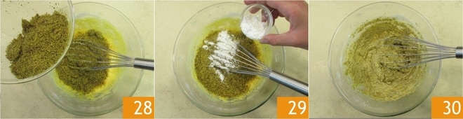 Añade la harina de pistachos 28, la sal y el almidón de maíz 29, luego incorpora los polvos con el batidor 30. Transfiere la crema a una manga pastelera y reserva.