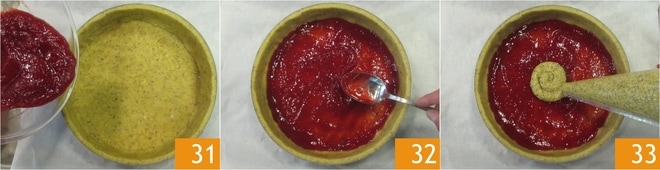 Ahora, retoma la masa y extiende sobre la base una fina capa de mermelada de frambuesas, que habrás tamizado previamente 31 32, luego añade la crema frangipane 33.