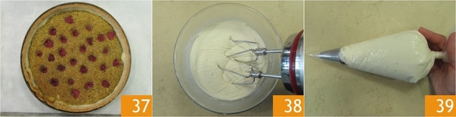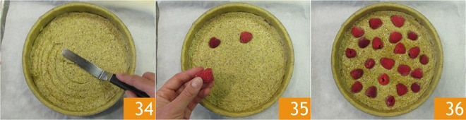 Extiende uniformemente la crema con una espátula hasta unos pocos milímetros del borde 34, luego incrusta las frambuesas presionando suavemente 35. Hornea en horno ventilado precalentado a 160° durante 30 minutos 36.