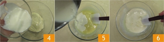 En un bol aparte, mezcla el yogur con el chocolate fundido 4, luego añade la leche, todavía caliente, en varias veces 5 y mezcla bien con la espátula 6.