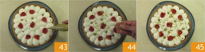 Cuando la tarta esté fría, extiende en la superficie una fina capa de mermelada de frambuesa 40, luego cubre todo con rosetones de namelaka 41 y decora con algunas frambuesas frescas 42.