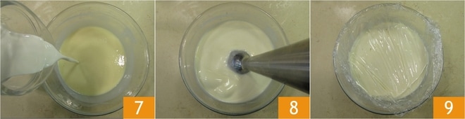 Finalmente, añade la nata fría en hilo fino 7 y emulsiona con una batidora de inmersión 8. Cubre con film en contacto y deja reposar en la nevera durante al menos 8 horas 9.