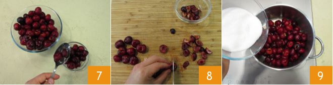 Vierte la mezcla obtenida en un molde desmontable de 22 cm de diámetro forrado con papel de horno 4 y, con el dorso de una cuchara, presiona bien la mezcla en el fondo del molde para obtener una base compacta y lisa 5. Deja reposar la mezcla en el congelador durante al menos media hora para que la base se vuelva sólida. Mientras tanto, procede a preparar la cobertura: lava y deshuesa 900 g de cerezas 6.