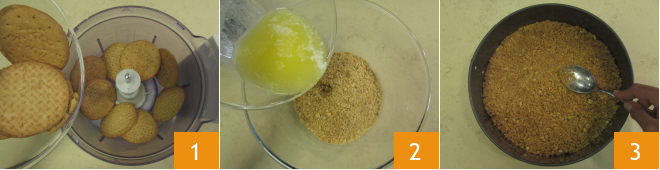 Para realizar la tarta de queso con yogur, higos y miel primero dedícate a la base de la tarta: derrite la mantequilla a fuego muy bajo y deja que se enfríe un poco. Pon las galletas en un procesador de alimentos 1 y tritúralas. Añade a las galletas la mantequilla derretida anteriormente 2 y mezcla bien para integrar. Utiliza la mezcla obtenida para cubrir la base de un molde de 24 cm de diámetro forrado con papel de horno. Presiona bien con el dorso de una cuchara para que tenga el mismo grosor 3 y ponlo en el refrigerador para que se endurezca durante unos 30 minutos.