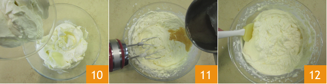 En un bol grande mezcla el yogur griego con el queso crema 10 y mezcla (con batidoras eléctricas o con una espátula), luego añade la miel en la que has disuelto la gelatina ya templada 11 y mezcla nuevamente 12.