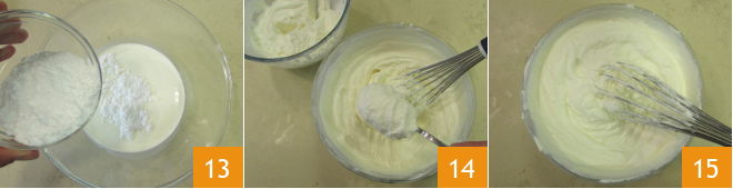 Vierte la nata en otro bol, añade el azúcar glas 13 y bate con las batidoras para obtener una consistencia firme y espumosa. Añade la nata montada a la mezcla de yogur y queso 14 mezclando bien con una batidora (o la espátula) 15.