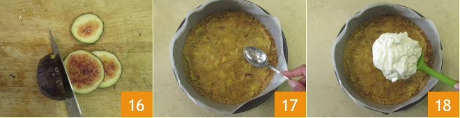 Corta 200 g de higos en rodajas de 2-3 mm de grosor, sin quitar la piel: te servirán para el relleno 16. En este punto, saca la base de galletas del refrigerador y unta los higos cocidos encima, que ya se habrán enfriado 17. Añade la mitad de la crema 18 y nivela con una espátula.