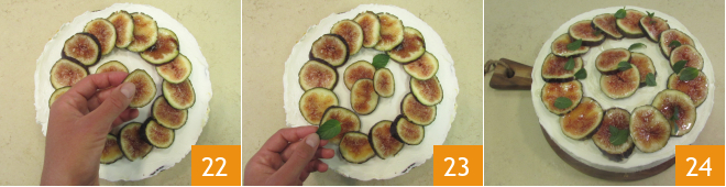Coloca las rodajas de higos sobre toda la superficie 19 y cubre con la crema restante 20. Nivela con la espátula 21 y ponlo en el refrigerador para que se endurezca durante al menos 4-6 horas.