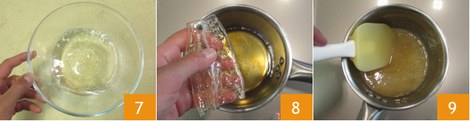 Ahora prepara la crema: pon la gelatina en remojo en agua fría durante unos 10 minutos 7 mientras tanto calienta la miel en un cazo. Cuando la miel esté a punto de hervir, apaga el fuego y añade la gelatina bien escurrida 8, luego mezcla rápidamente para integrar 9 y deja que se enfríe un poco.