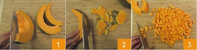 Para realizar la cheesecake fría de calabaza, primero cortad la calabaza en rodajas 1, eliminad la piel 2 y reducid la pulpa en pequeños cubos 3: en total necesitaréis 450 g de calabaza limpia.