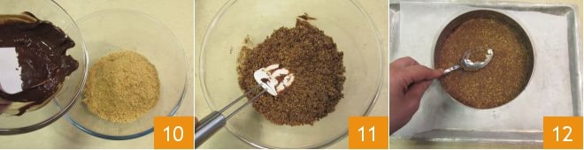 Añadid el chocolate fundido al polvo de galletas 10 y mezclad con una espátula para amalgamar bien la mezcla 11. Ahora colocad un aro de 18 cm de diámetro en una bandeja forrada con papel de horno y cubrid los lados, si es posible, con una hoja de acetato, para que sea más fácil desmoldar. Distribuid la mezcla de galletas dentro del aro y compactad bien con el dorso de una cuchara 12, luego dejad que la base se solidifique en el frigorífico durante 20-30 minutos.