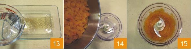 Mientras tanto, poned las hojas de gelatina en remojo en agua fría durante unos 10 minutos 13. Cuando la calabaza esté cocida, vertedla en un procesador de alimentos 14 y trituradla para reducirla a puré 15, luego dejadla templar.